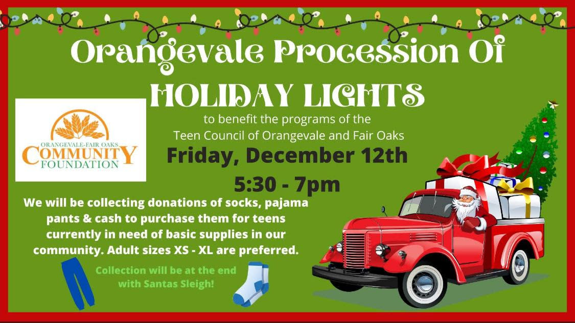The Orangevale Procession of Holiday Lights is coming up on Friday, December 12th from 5:30 to 7 pm. This festive community tradition supports the Teen Council of Orangevale and Fair Oaks, and they’ll be collecting socks, pajama pants, and cash to help local teens in need of basic essentials. Adult sizes XS–XL are preferred. Donations can be made at the end of the route with Santa’s Sleigh. Bundle up and bring the whole family! Click on the link for more info! https://cf-ovfo.ticketspice.com/2025-ov-procession-of-lights